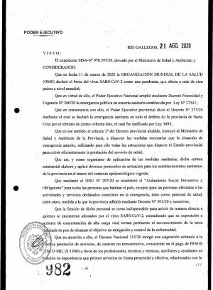 El Decreto 982/20 del 21 de agosto apunta a personal vinculado a las tareas que demanda el brote de casos en Río Gallegos que se encuentra en Aislamiento Social, Preventivo y Obligatorio y que “viene trabajando en la trinchera, casi sin descanso , en la localidad más afectada por el COVID-19”, indicaron desde la provincia.