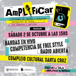 Este sábado 2 de octubre la Secretaría de Estado de Cultura realizará el lanzamiento oficial del certamen #AmplificarSantaCruz en el jardín interno del Complejo Cultural de Río Gallegos. Dicha actividad, pensada para visibilizar a músicxs emergentes, dará inicio a partir de las 15:00 hs con la participación de bandas en vivo, competencia de freestyle y radio abierta.