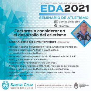 El Ministerio de Desarrollo Social, por medio de la Secretaría de Estado de Deporte y Recreación, invita a participar de un seminario virtual de atletismo que dictará el Lic. Omar Alberto Da Silva Henríquez el próximo viernes a las 18hs. El mismo se enmarca en el programa nacional “Escuelas Deportivas Argentinas” (EDA) y es de carácter gratuito.