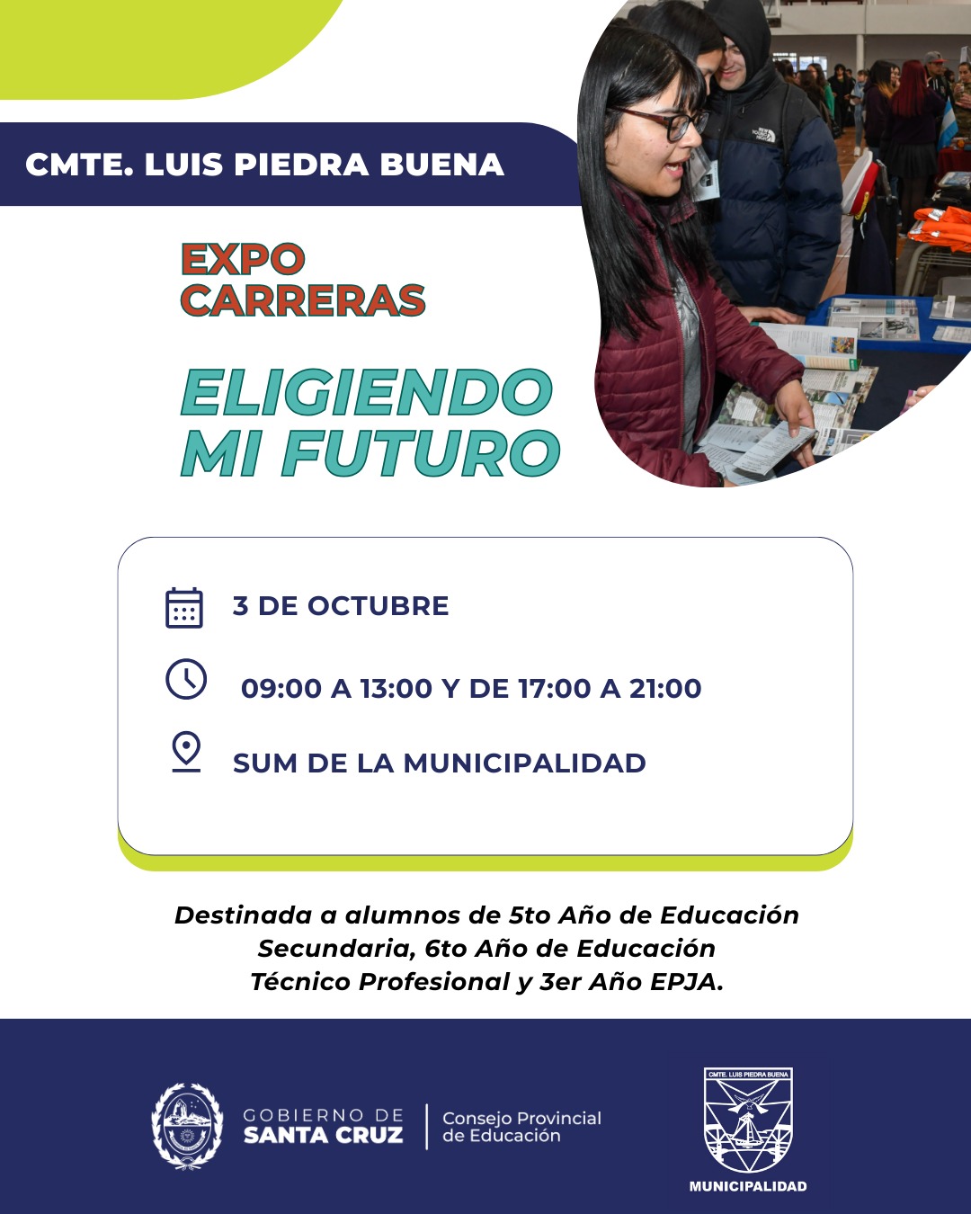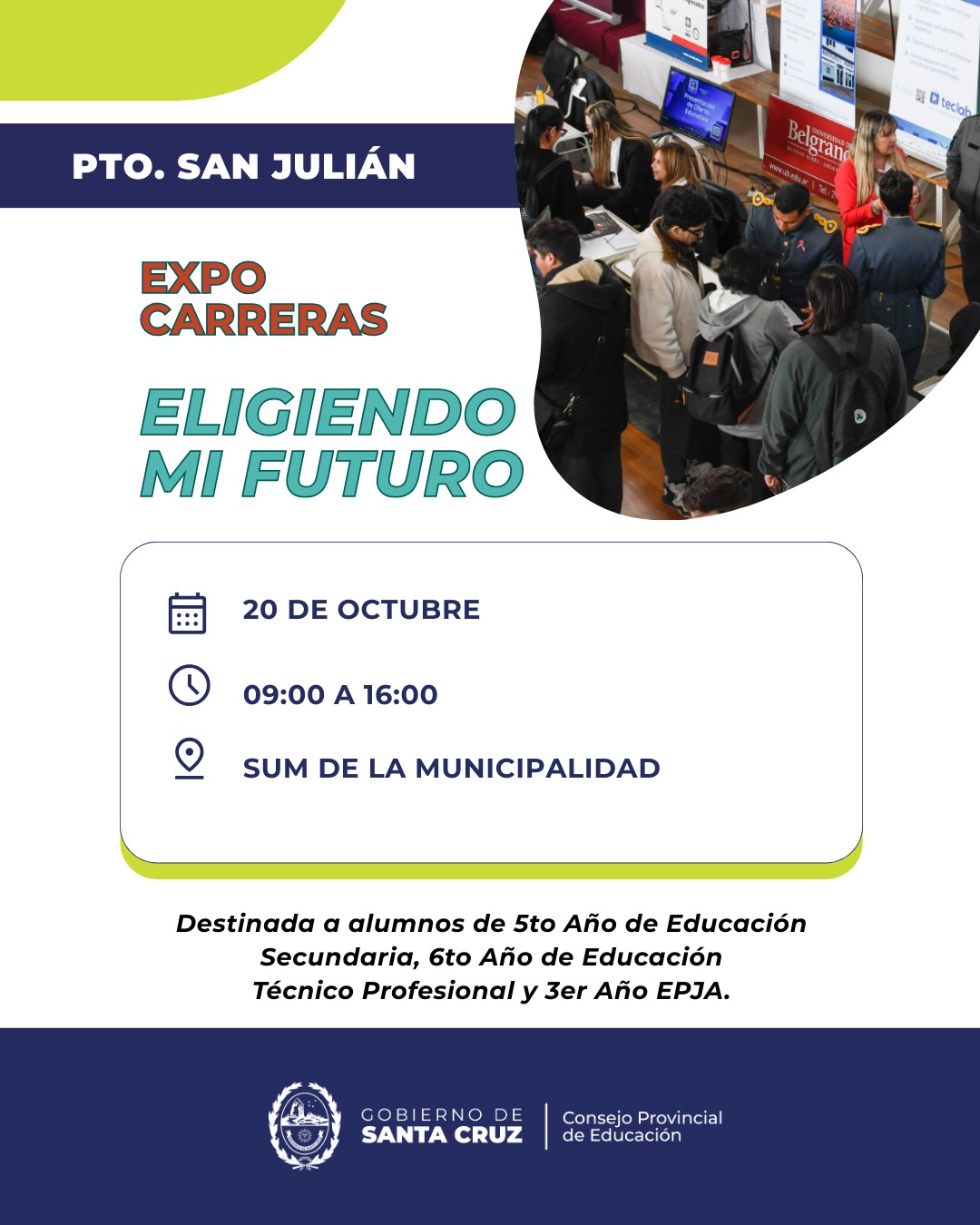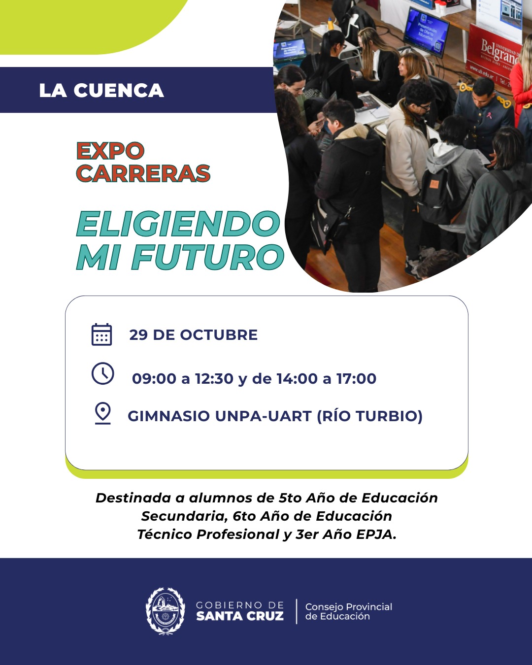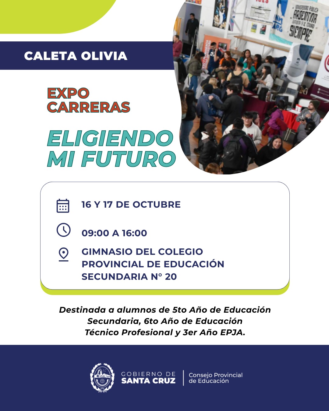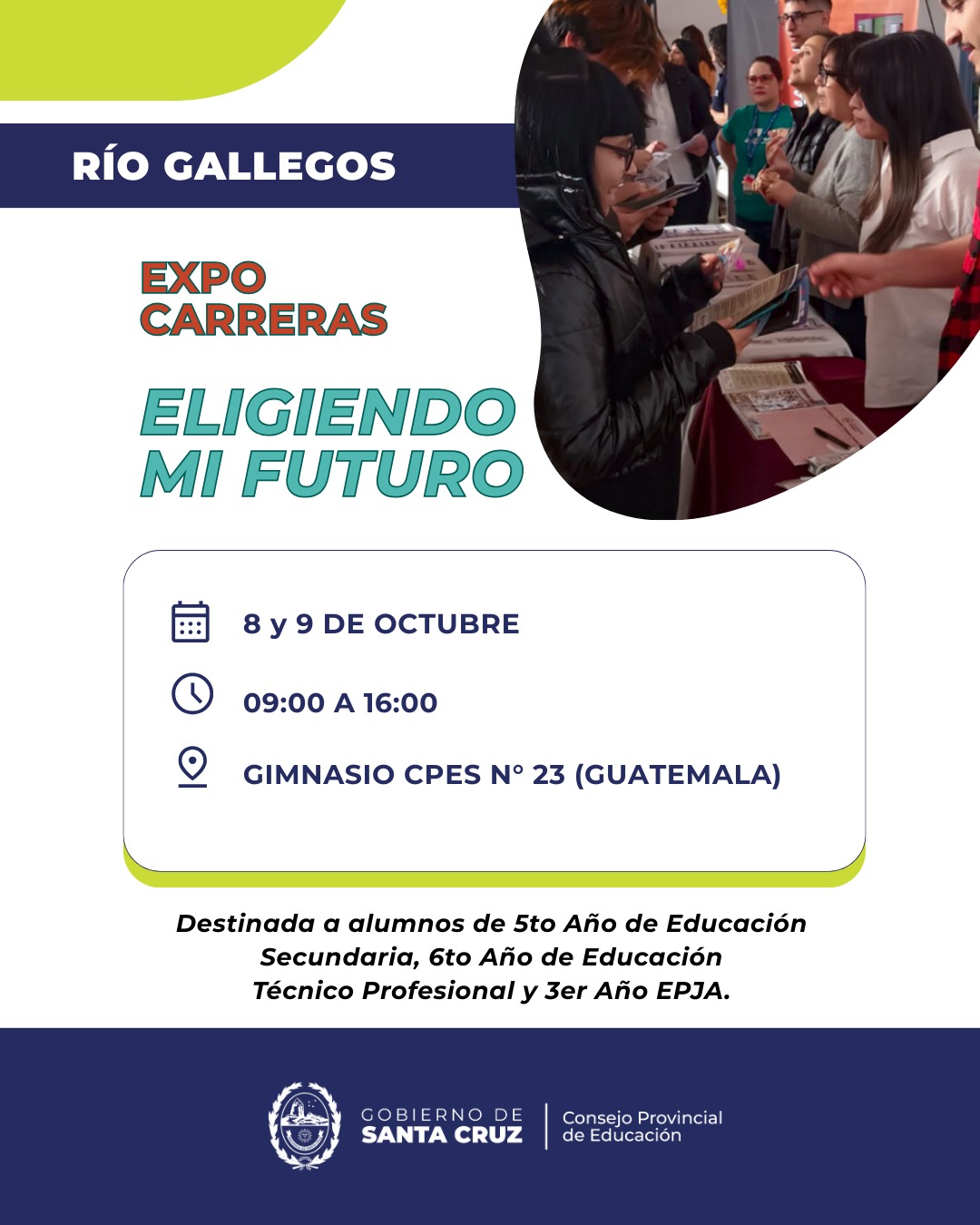 Con ese objetivo, se invita a participar de la Expo Carreras “Eligiendo mi futuro”, destinada a alumnos de 5to Año de Educación Secundaria, 6to Año de Educación Técnico Profesional y 3er Año EPJA. La actividad contará con la participación de instituciones de Nivel Superior, organismos gubernamentales y Fuerzas de Seguridad del Estado, presentes en toda la provincia para dar a conocer sus propuestas de formación.