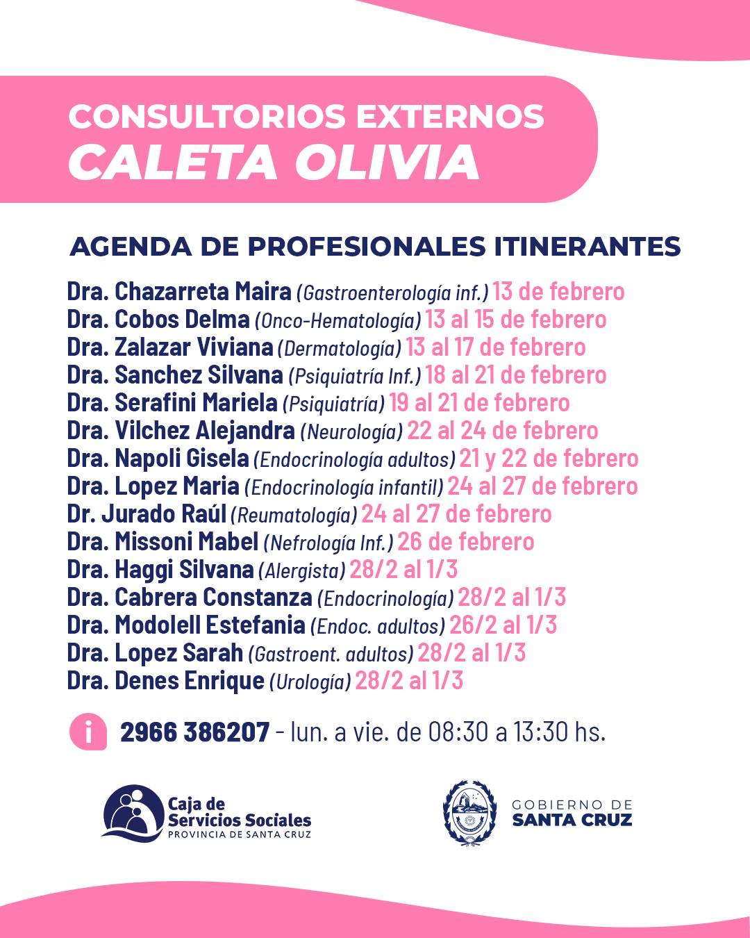 Turnos e información (Caleta Olivia): 2966 386207