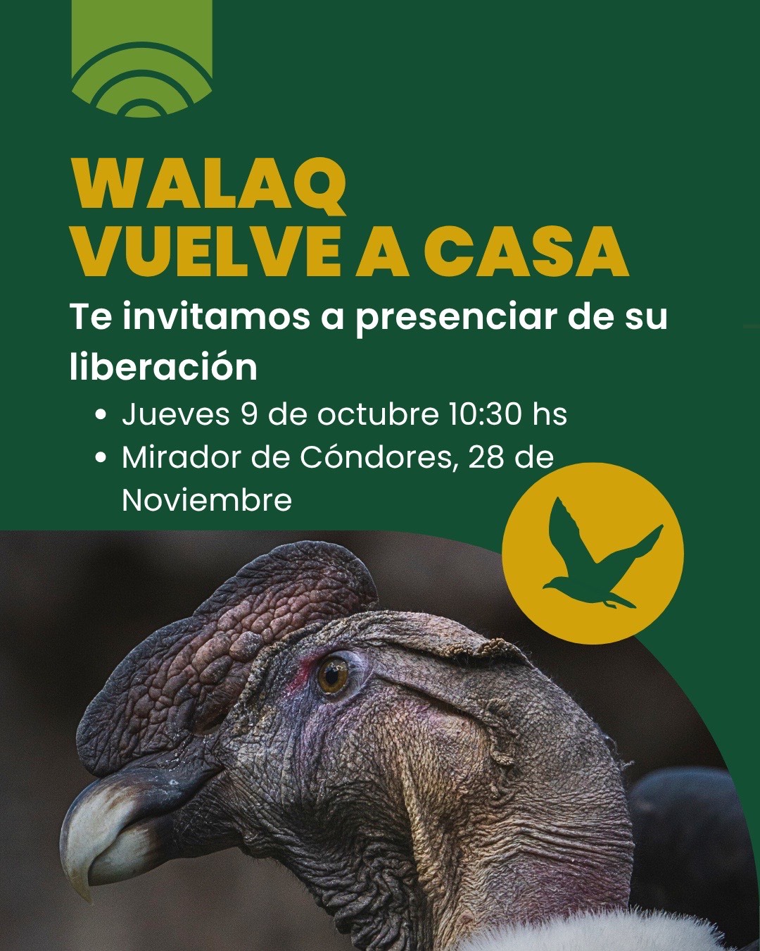 Walaq es un cóndor andino juvenil de entre 8 y 9 años, con un peso de 13 kg, rescatado en mayo cerca del Paso Fronterizo Río Mayo por Gendarmería Nacional tras presentar dificultades para volar. Fue trasladado a El Calafate y luego a Buenos Aires, donde se recuperó favorablemente en la Fundación Temaikèn. Completamente rehabilitado, Walaq está listo para regresar a los cielos de Santa Cruz.