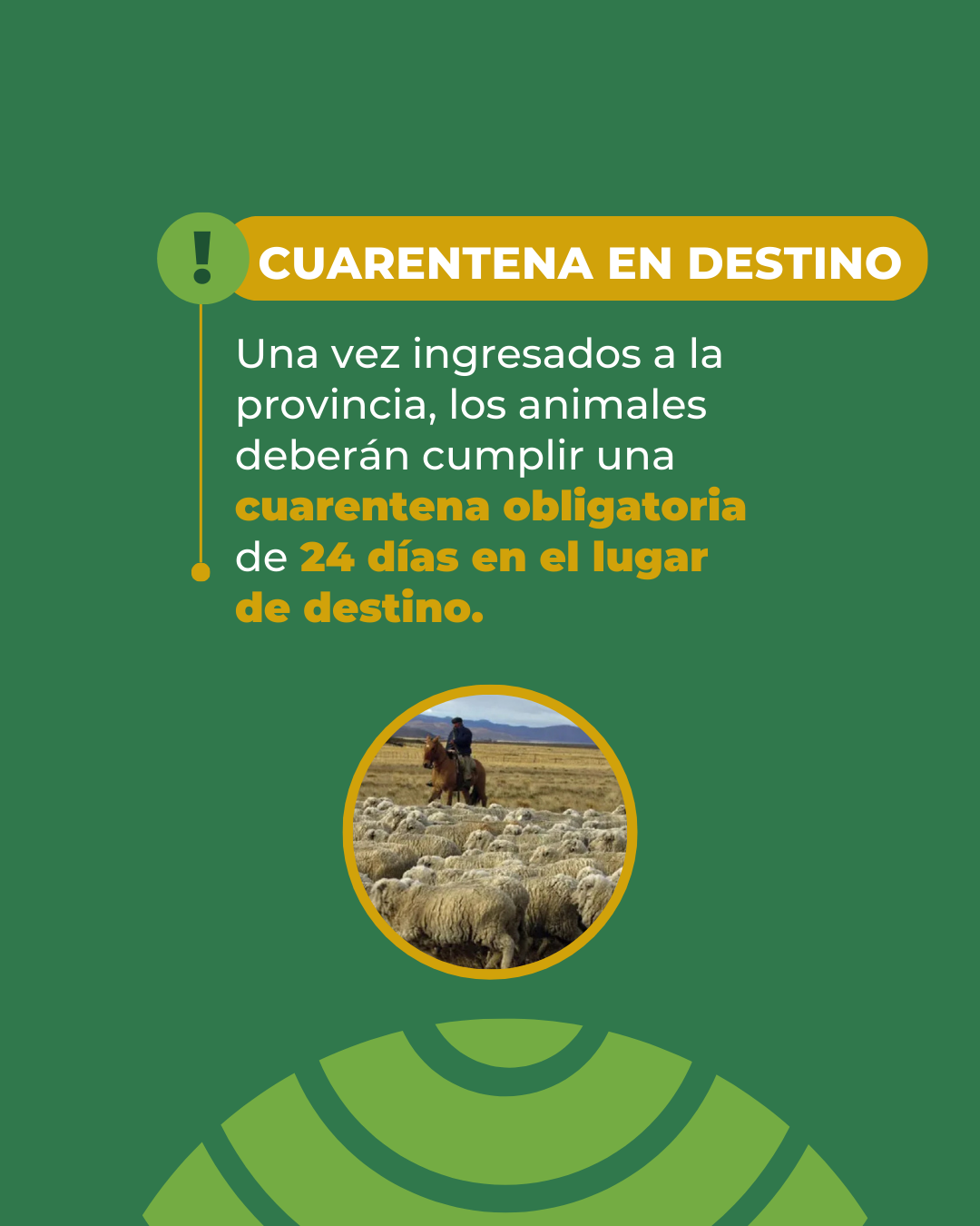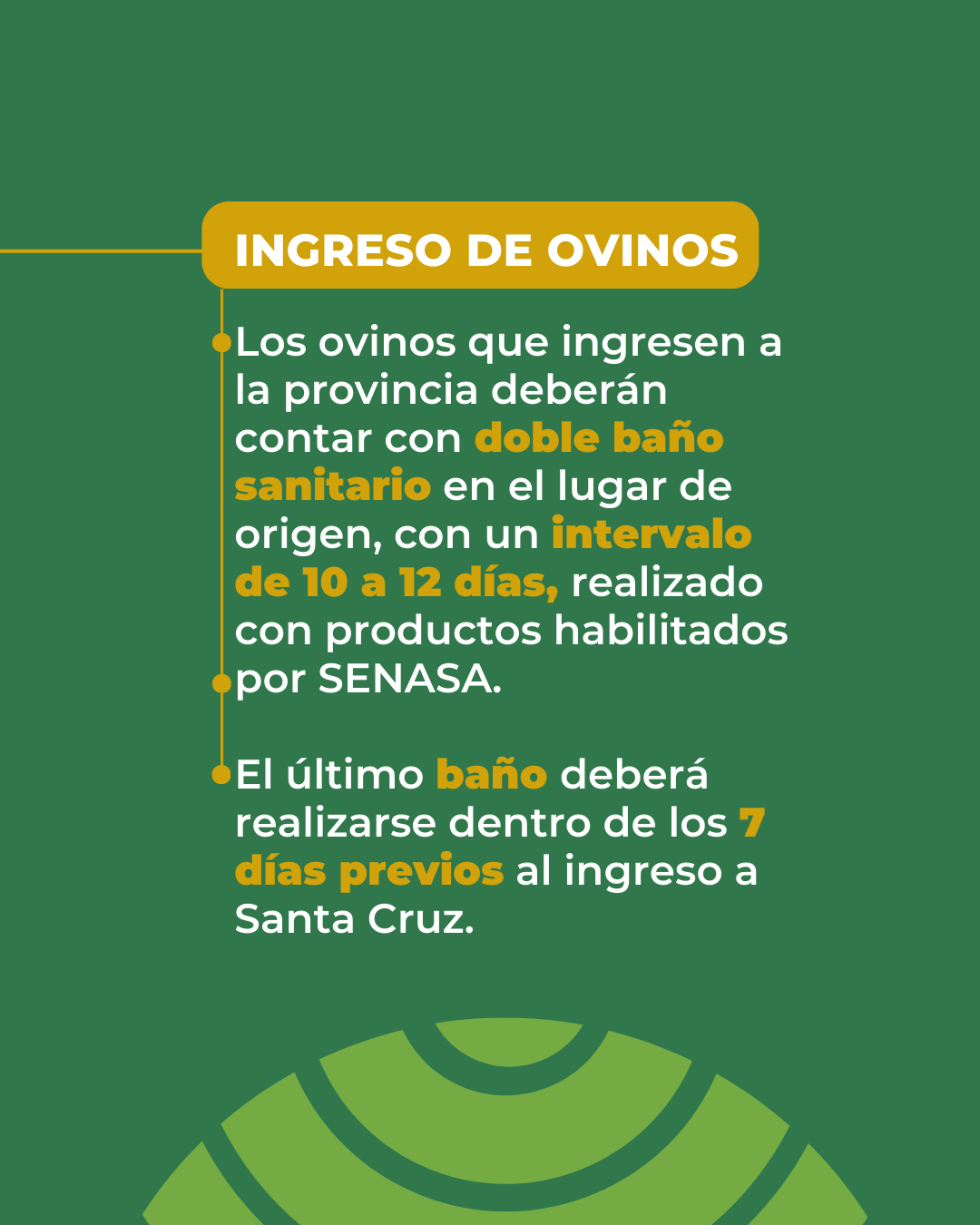 En este marco, se aprobó una resolución acordada en el ámbito de la Comisión Provincial de Sanidad Animal (COPROSA) que establece que todos los ovinos que ingresen a la provincia desde el norte del paralelo 46° Sur deberán contar con doble baño sanitario en origen, utilizando productos acaricidas aprobados por SENASA, y cumplir con una cuarentena obligatoria de 24 días en destino. Asimismo, los ovinos destinados a faena deberán provenir de zonas declaradas libres de sarna ovina y tener como destino plantas de faena habilitadas para tránsito federal.