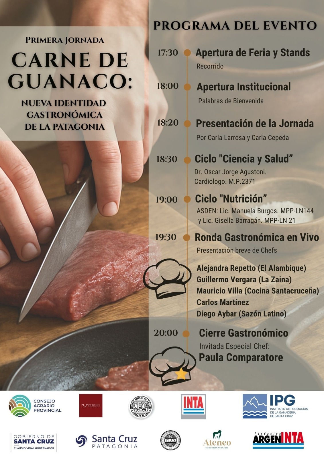 Entre los chefs invitados estarán Paula Comparatore como invitada especial, junto a Alejandra Repetto, Guillermo Vergara, Mauricio Villa, Carlos Martínez y Diego Aybar, quienes protagonizarán demostraciones en vivo, compartiendo técnicas, recetas y distintas formas de trabajar la carne de guanaco, con el objetivo de revalorizar este recurso como producto identitario y con potencial productivo en la Patagonia.