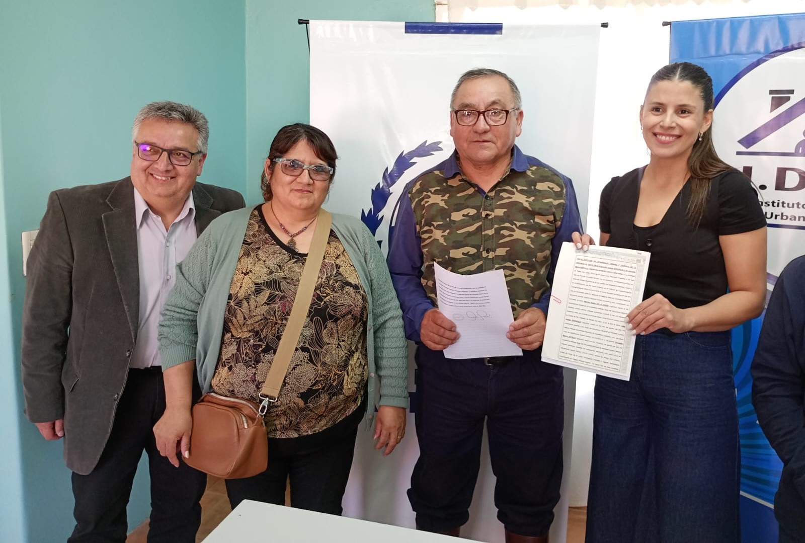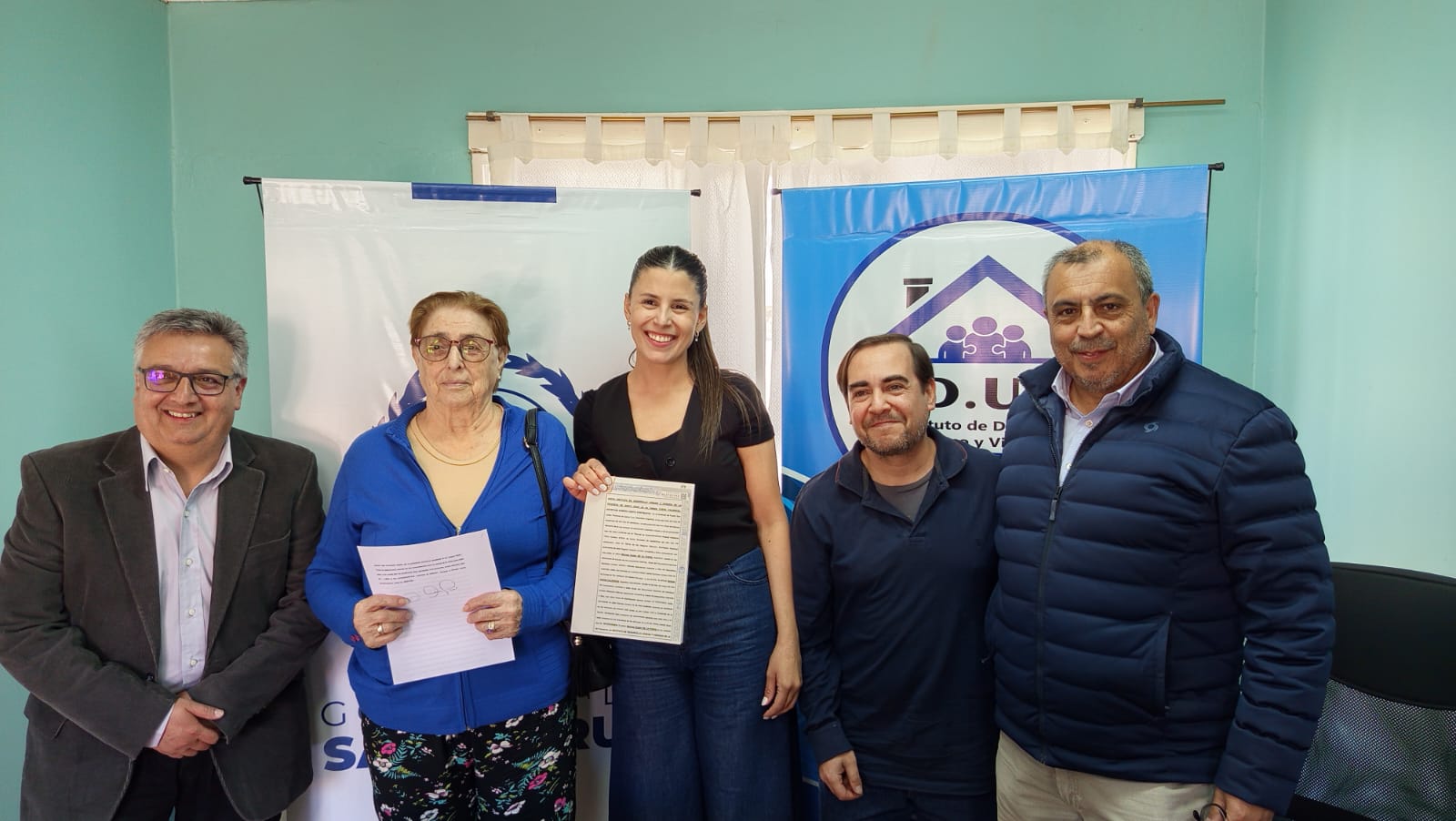 El acto de firma contó con la presencia del presidente del IDUV, Marcelo De La Torre; el vocal por el Ejecutivo, Pablo Álvarez; el director de Escrituraciones del organismo, Alberto Oyarzo; y la escribana Milagrosa Manucci.