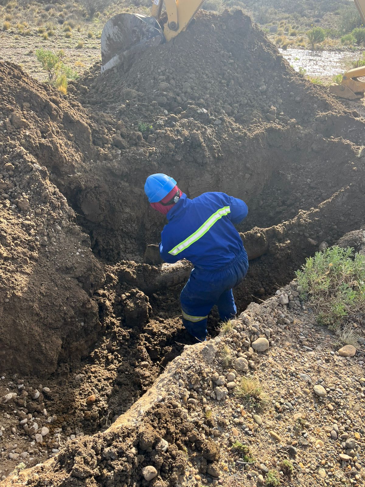 En una labor conjunta con la empresa Quintana Energy, el sector de saneamiento realizó con éxito la reparación del acueducto principal de 200mm que abastece a la cisterna de 500m3. Es importante destacar que la tarea se realizó en tiempo y forma, utilizando una retroexcavadora provista por la operadora, sin afectar el caudal de agua para la localidad.