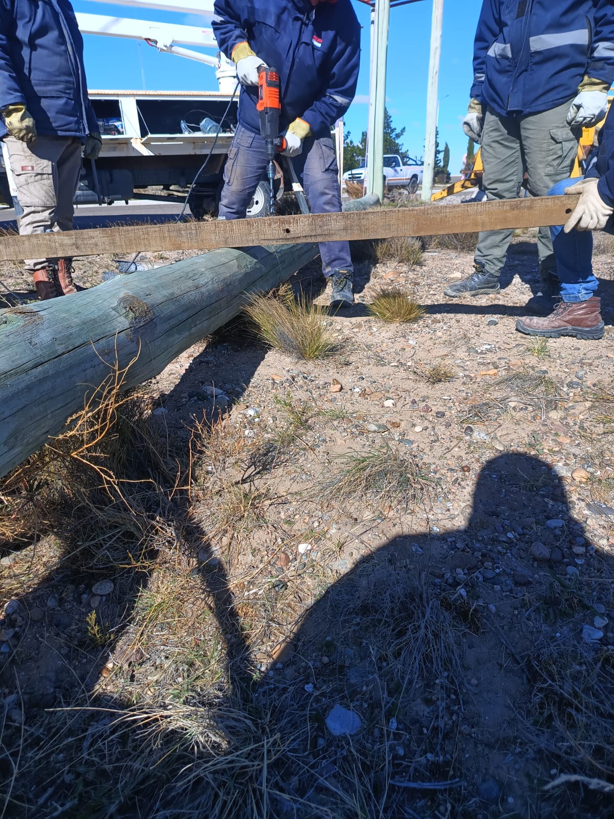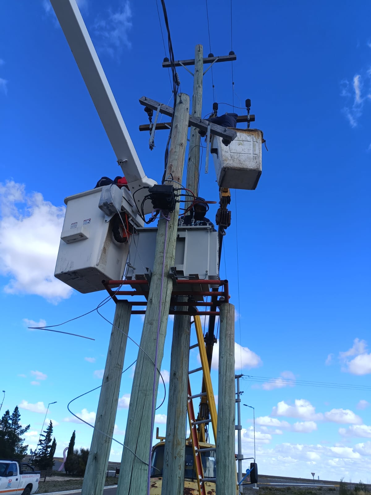 Durante la madrugada del viernes, aproximadamente a las 02:00 hs, se registró una falla en la red eléctrica de Jaramillo debido al incendio de una cruceta que afectó un transformador. A pesar de las condiciones climáticas adversas y los fuertes vientos, el personal operativo trabajó intensamente. A primera hora de la mañana, se sumó una cuadrilla de Fitz Roy con equipamiento pesado (grúa) para concretar el reemplazo del poste, la verificación del transformador y la reconstrucción de los puentes aéreos de media tensión.