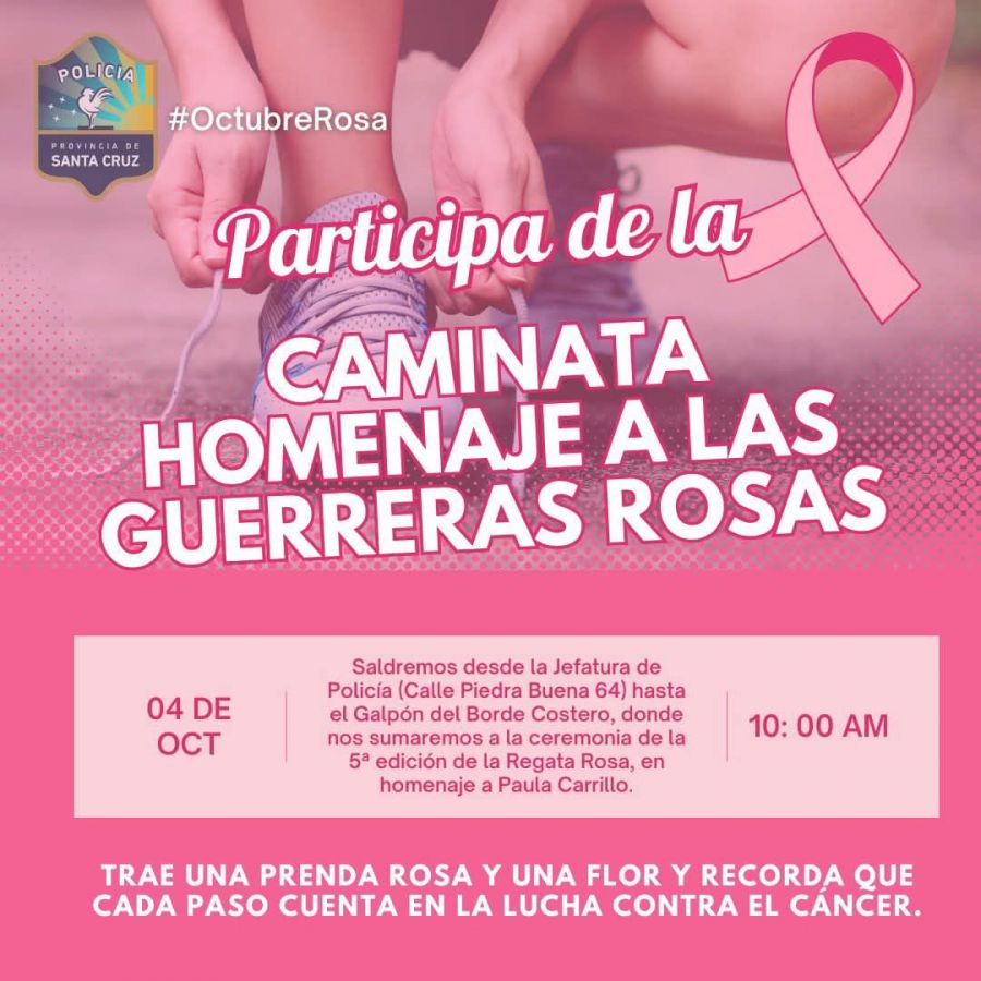 En el marco del octubre Rosa, denominado así mundialmente por llevarse a cabo diferentes actividades en torno a generar conciencia para luchar contra el cáncer de mama, la Policía de Santa Cruz convoca a toda la comunidad a participar de la caminata en homenaje a las Guerreras Rosas del Viento. Dicha actividad, tendrá lugar el próximo sábado 4 de octubre, desde las 10:00, partirá desde la Jefatura de Policía, sita en calle Piedra Buena N°64, y terminará en el galpón del borde costero.
