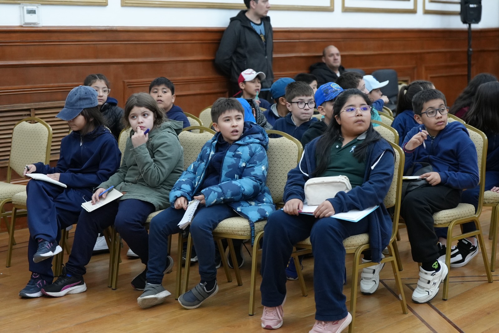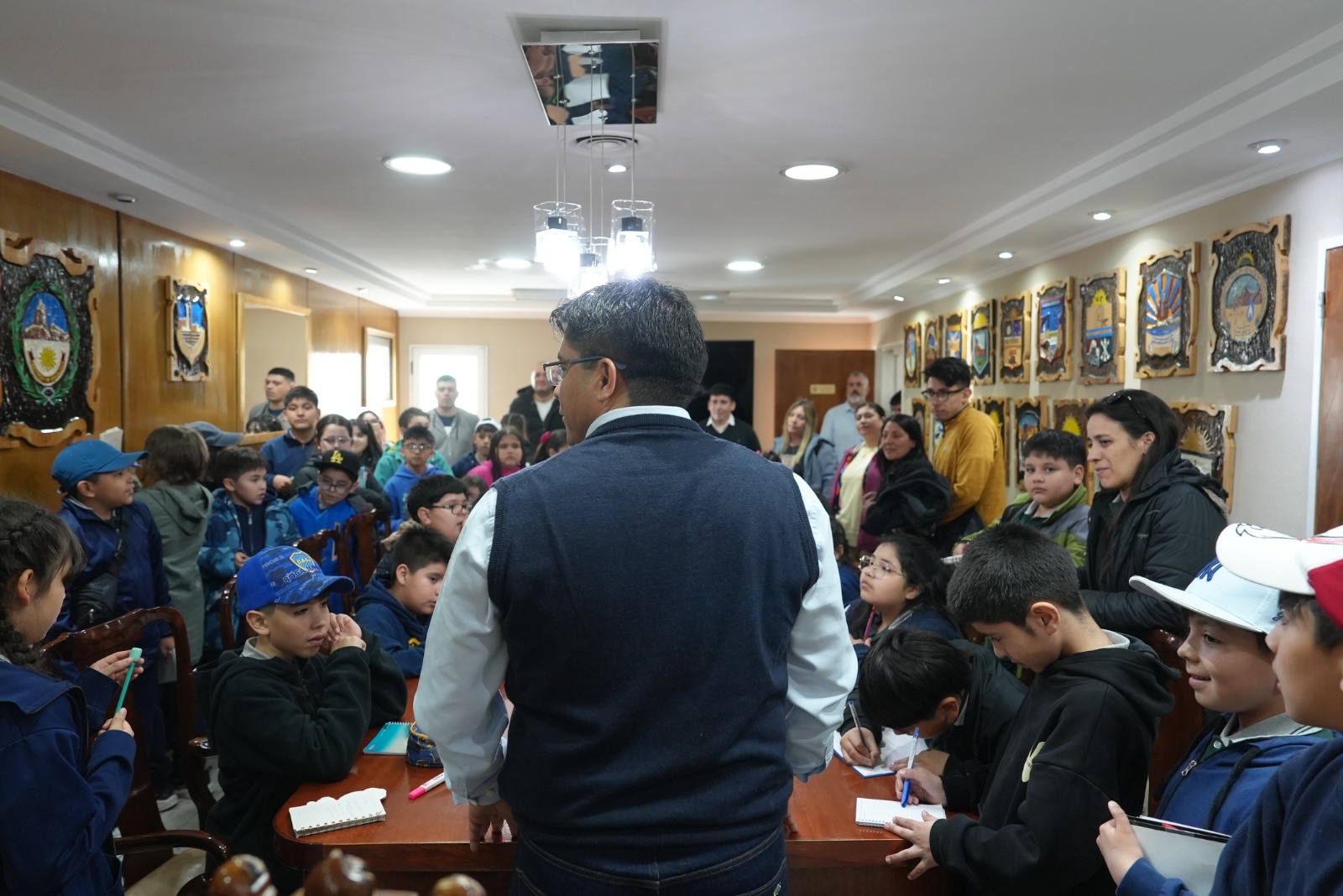 El mandatario provincial, acompañado por integrantes de su equipo de trabajo, compartió un momento muy especial con cincuenta y un alumnos de 4° grado del Colegio Santa Bárbara de Río Turbio. Los mismos fueron acompañados por los docentes, Nancy Cerdeyra, Bruno Carrizo, Cecilia Gómez, Ezequiel Juárez y Norma Rodríguez. A ellos se sumó también, el enfermero Robinson Godoy.