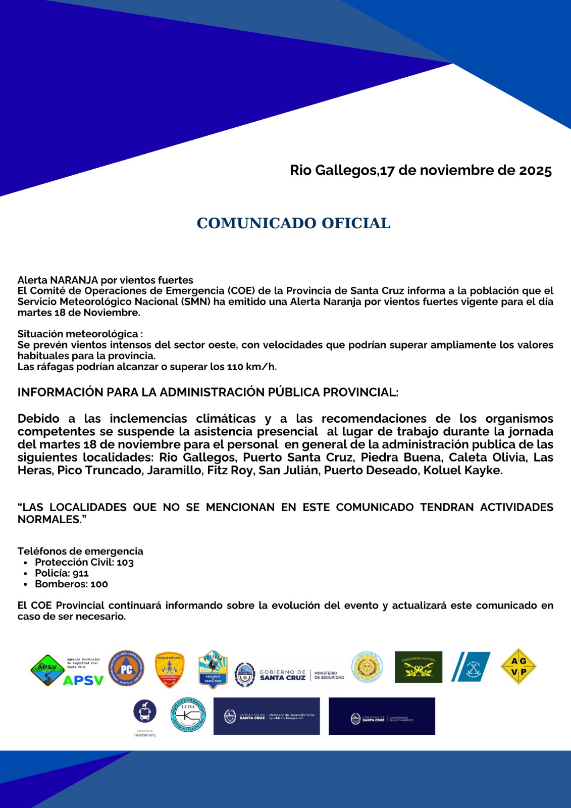 Se aclara que las localidades no mencionadas mantendrán actividades normales.