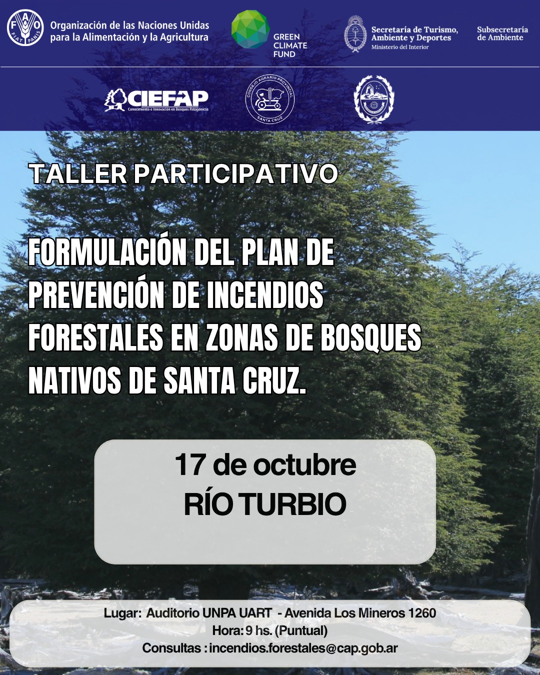 En este contexto, se desarrollan durante el mes de octubre una serie de talleres participativos bajo el título “Formulación del Plan de Prevención de Incendios Forestales en Bosques Nativos de Santa Cruz”, en las localidades de Lago Posadas, El Chaltén, El Calafate y Río Turbio.
