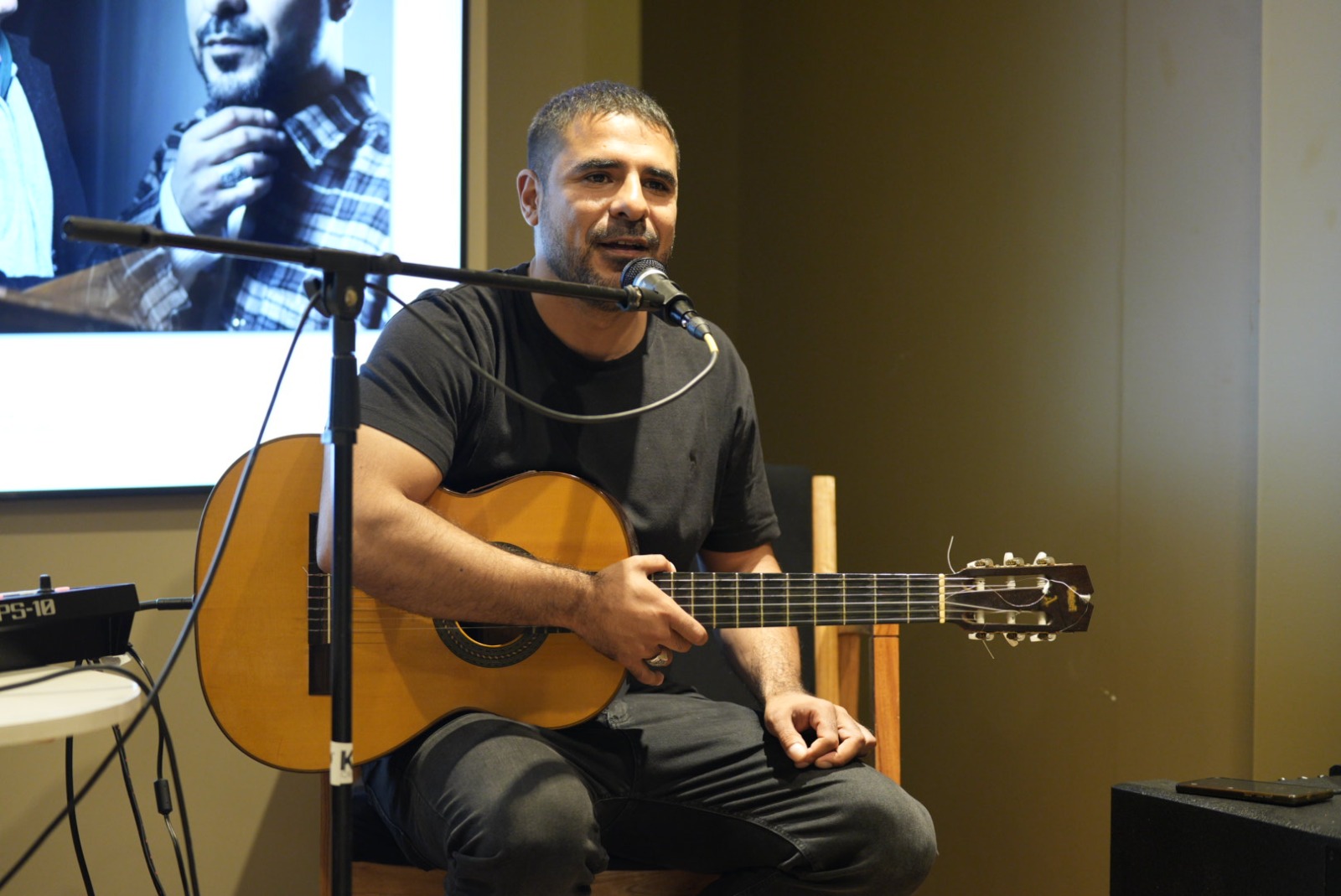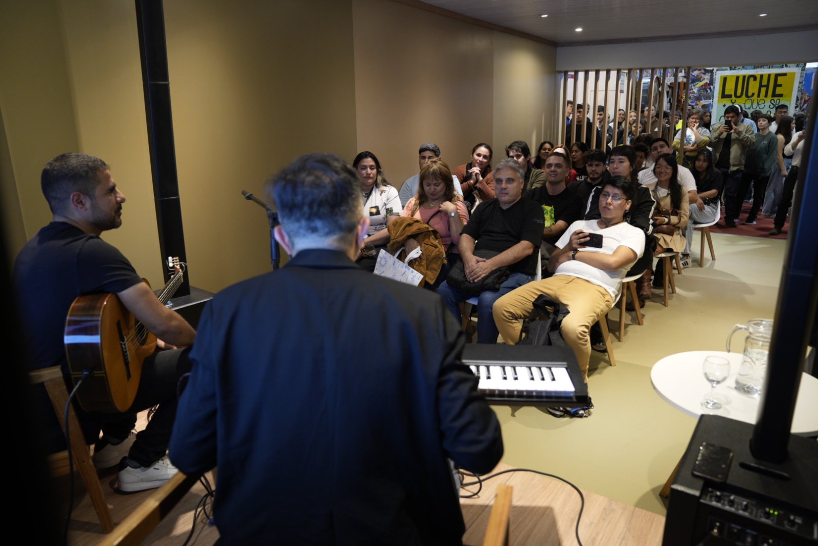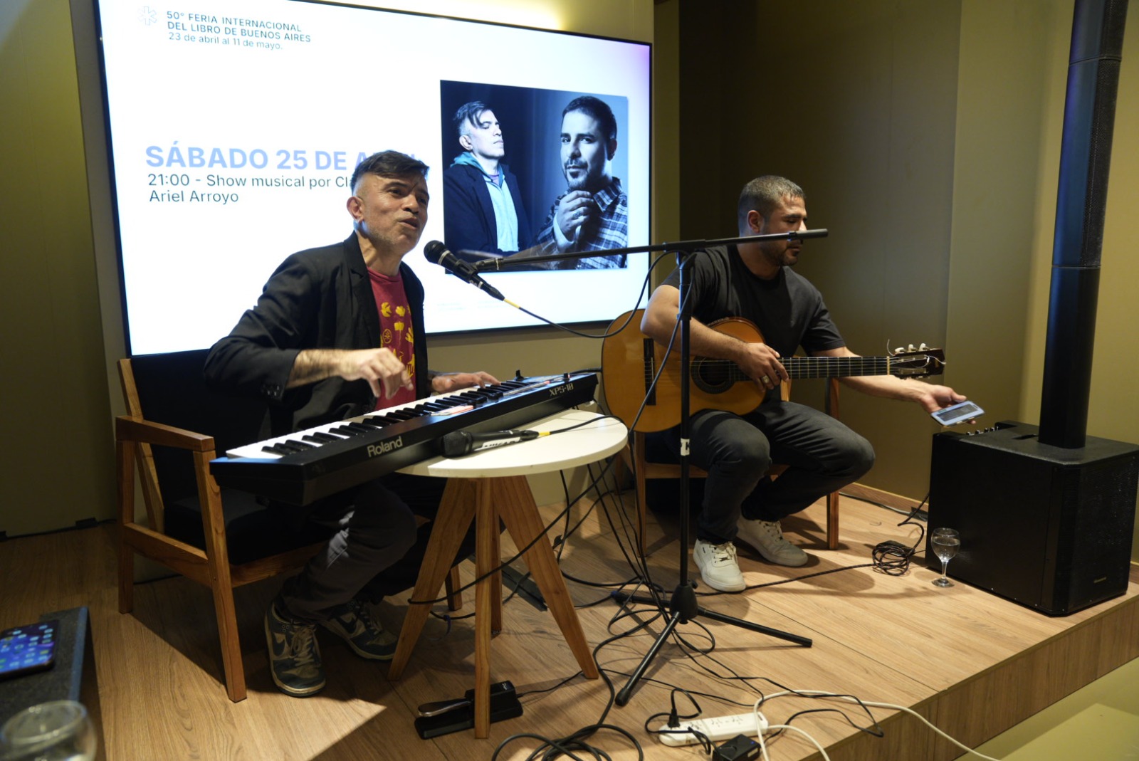 La música tuvo un lugar destacado con la presentación de Claus Videla y Ariel Arroyo. Videla interpretó su reciente lanzamiento Tan solo humano, acompañado de temas de su álbum Sur Blues. “La canción que lancé en YouTube el 17 de abril tuvo muy buenas repercusiones. Participa Miguel Ángel Erausquin de Pastoral en el video, y fue increíble cómo quedó. Ayer la pude cantar en vivo junto a Ariel Arroyo, con quien también compartimos una samba y otros temas”, comentó. Por su parte, Arroyo destacó la identidad santacruceña en su repertorio: “Hicimos un recorrido por canciones de mi autoría y también algunos clásicos de Hugo Jiménez Agüero. La idea en estos espacios fue mostrar nuestra identidad. Nosotros los que hacemos canciones trabajamos desde dos universos: el musical y el literario, y desde que Bob Dylan ganó el Nobel ya no se discutió más que la canción es una obra comprendida dentro de la poética”.