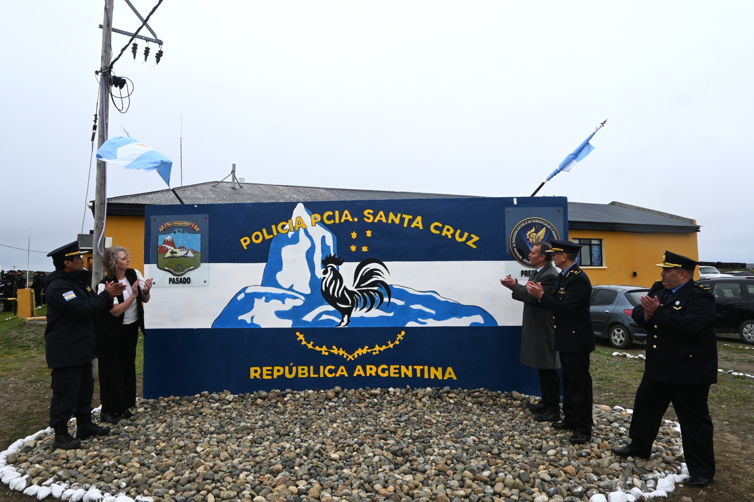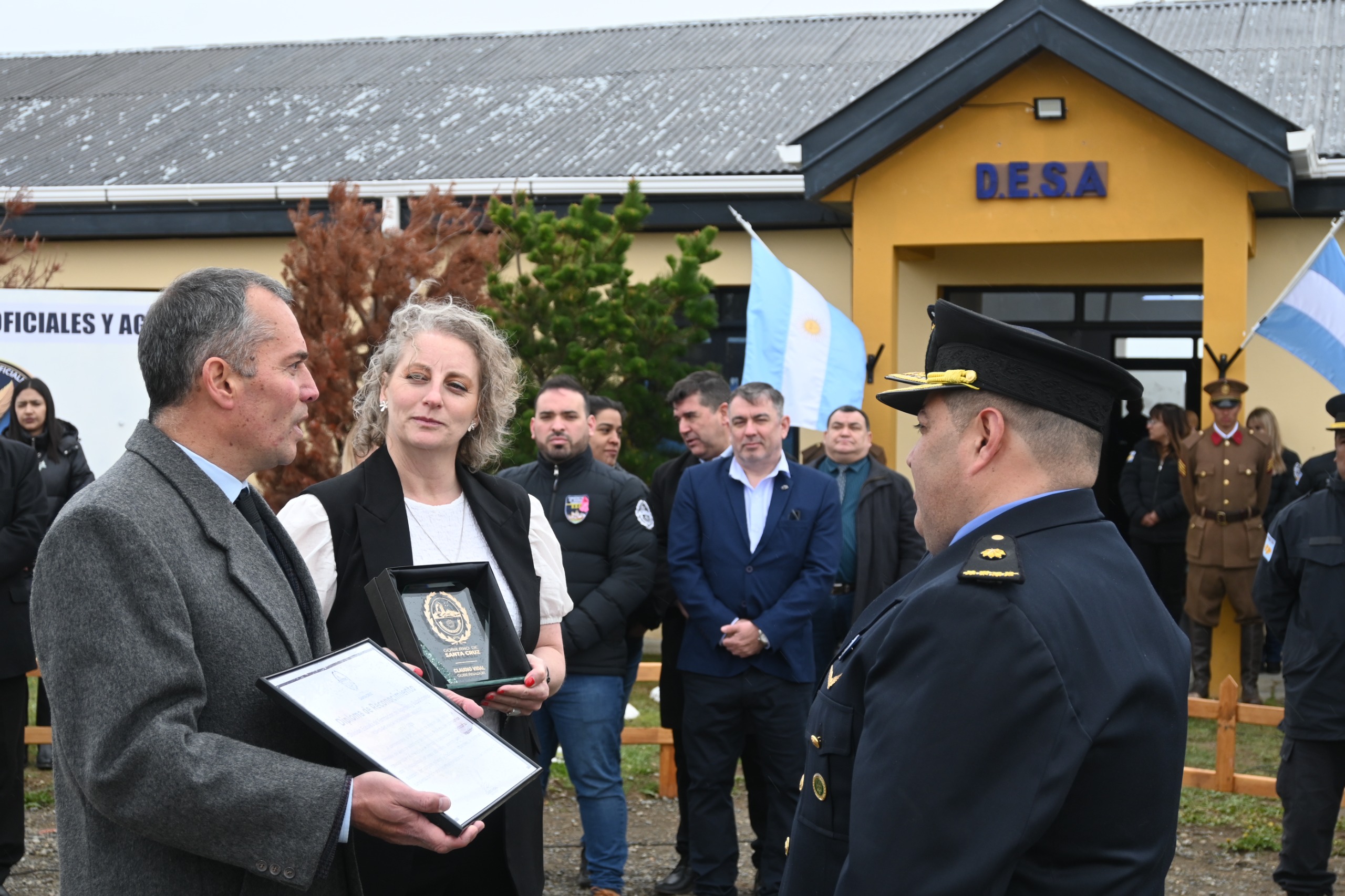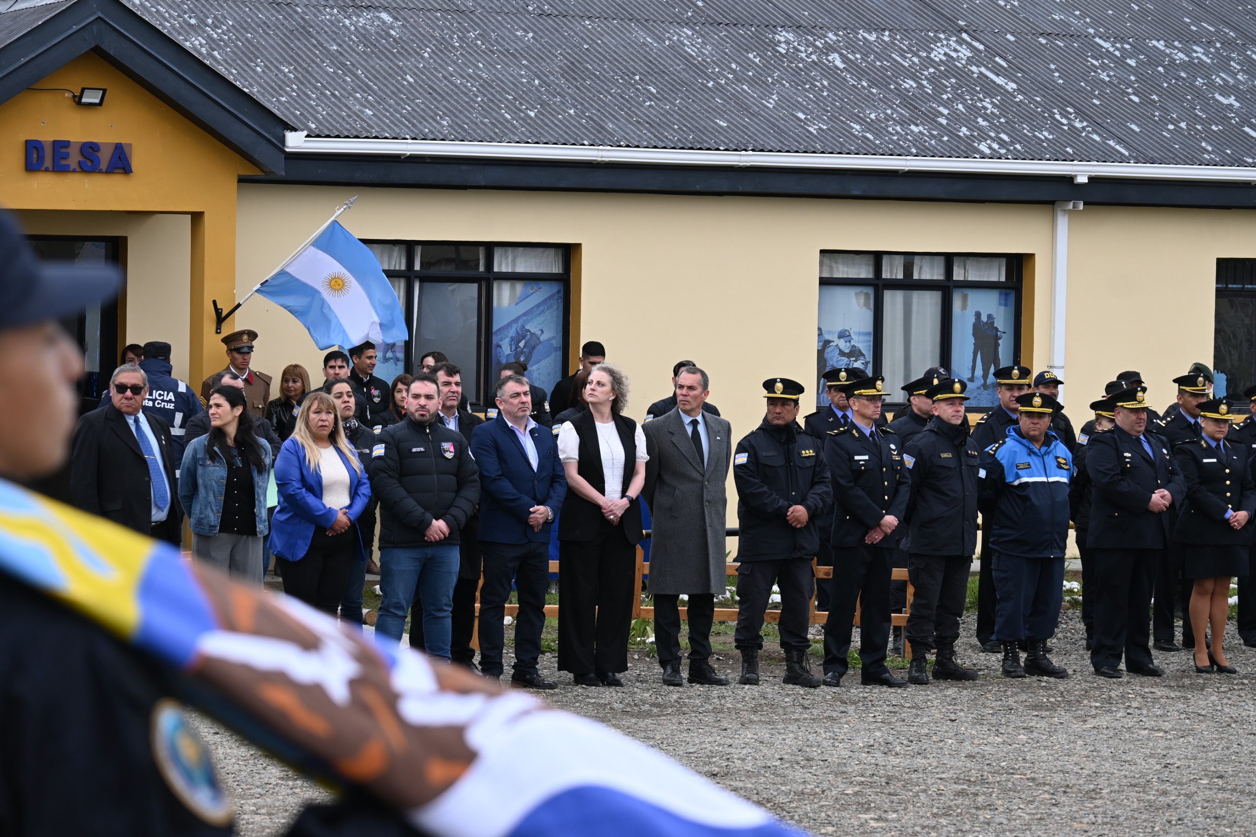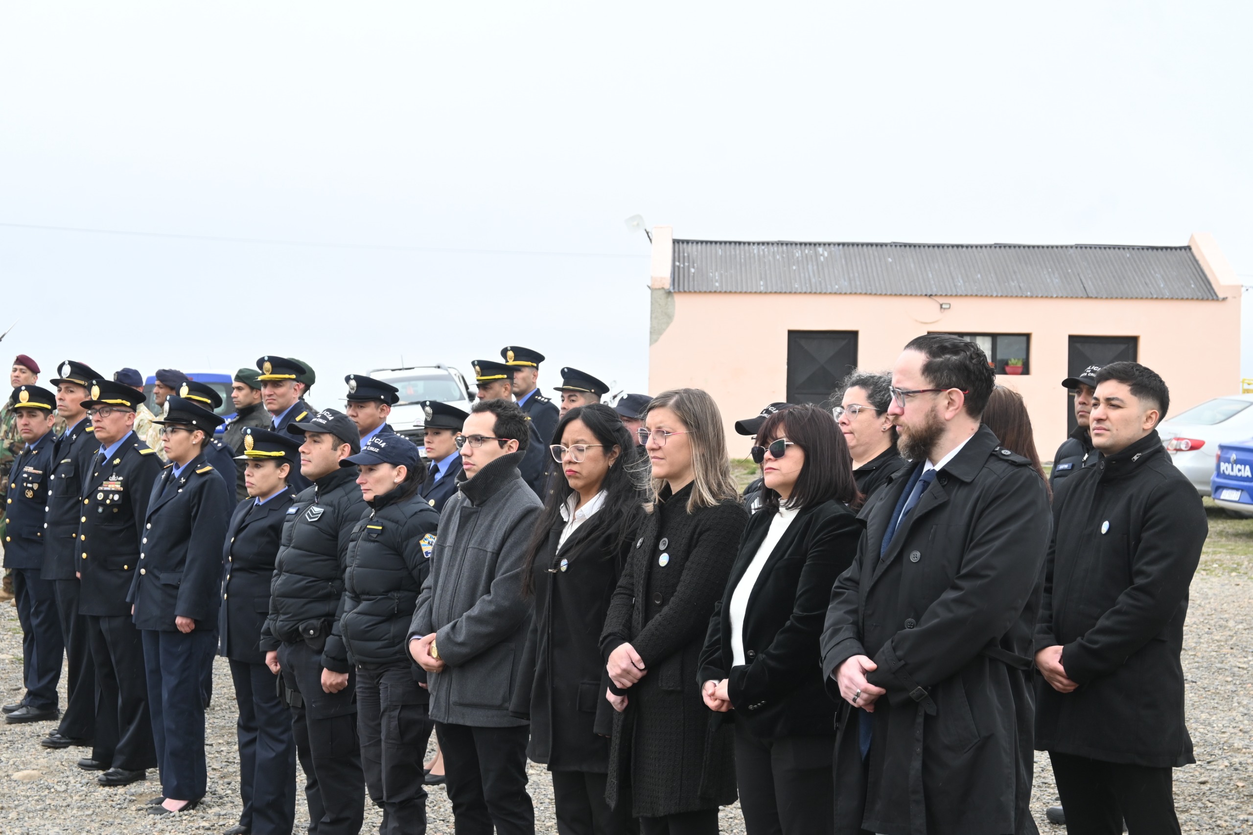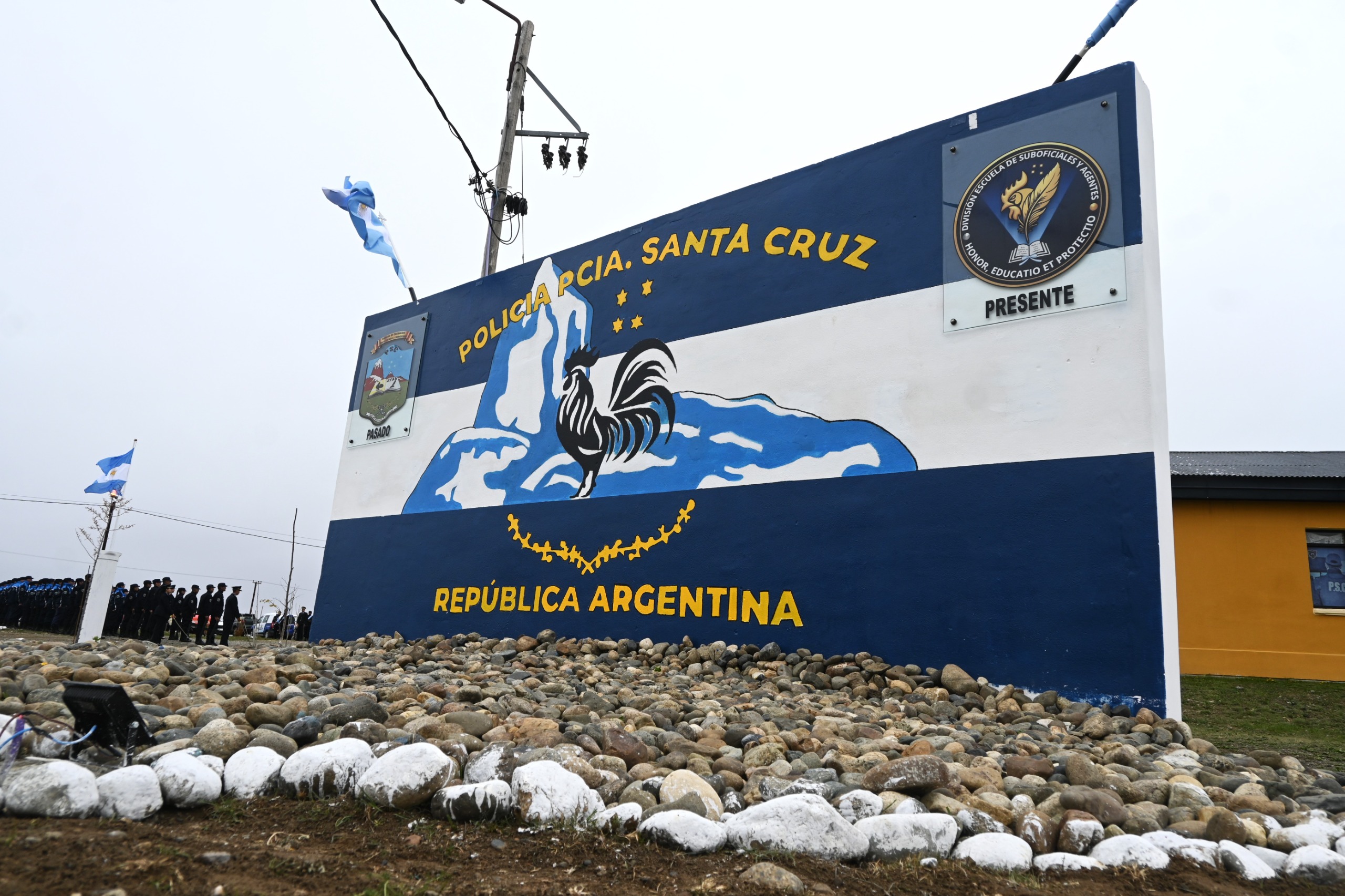 Durante la ceremonia, se repasó la trayectoria histórica de la institución, creada en 1974 bajo el nombre Escuela de Suboficiales y Tropa de la Policía de la Provincia de Santa Cruz “Juan Manuel Gregores”, con asiento en la localidad de Perito Moreno.