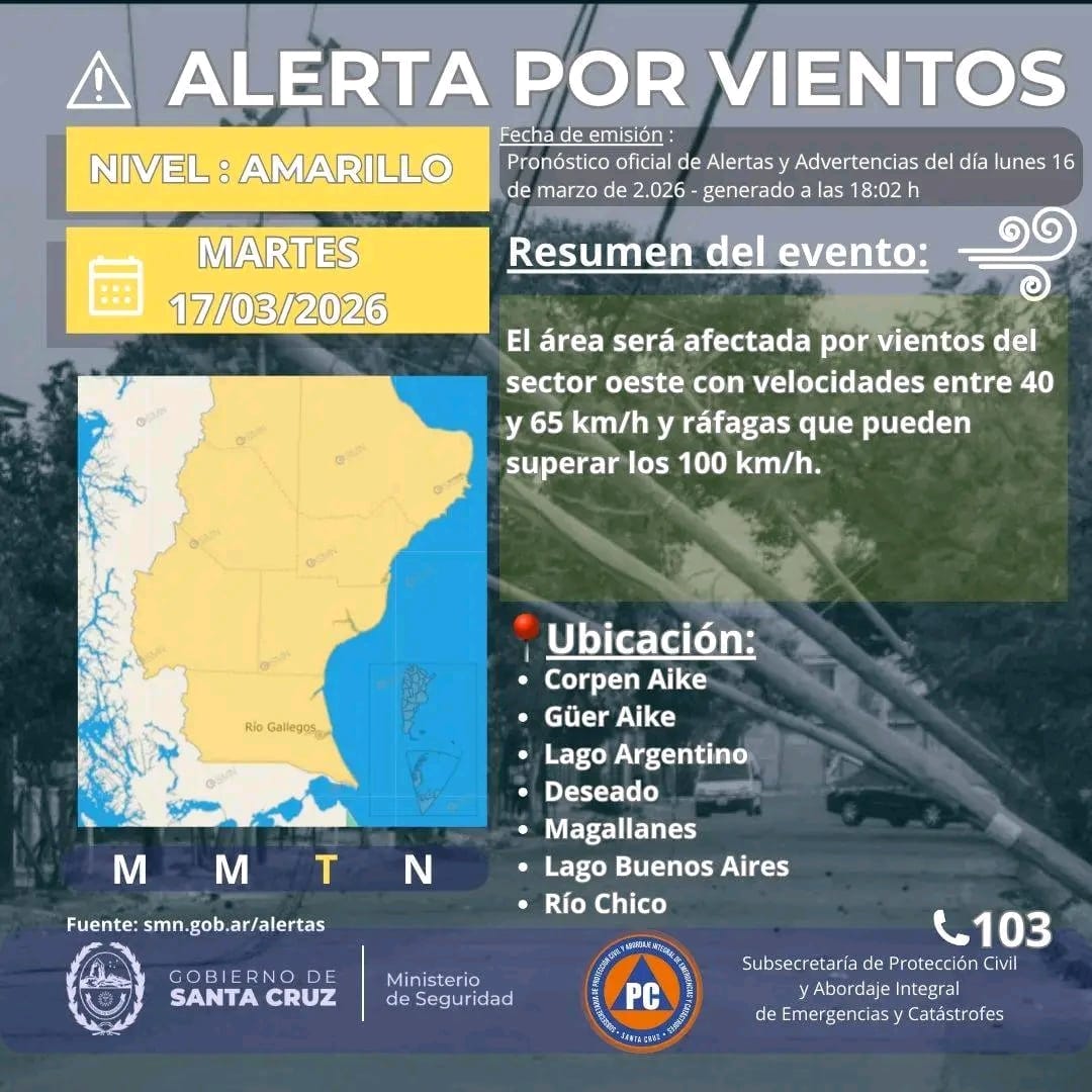 En paralelo, se encuentra vigente alerta amarilla por vientos para varias regiones de la provincia, incluyendo Corpen Aike, Güer Aike, Lago Argentino, Deseado, Magallanes, Lago Buenos Aires y Río Chico, donde se prevén vientos del sector oeste con velocidades entre 40 y 65 km/h y ráfagas que podrían superar los 100 km/h.
