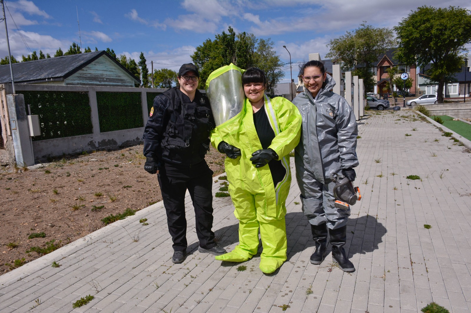 Otra especialización es la de la Brigada de Riesgo químico, biológico y sustancia peligrosa, que es una División en la que tenemos asentamiento en Río Gallegos. Y de acá se hace la atención a todo el ámbito provincial. Es decir, que, si se llega a producir un incidente con un vuelco de un camión, conteniendo sustancias peligrosas en su interior, la primera intervención la tenemos que dar desde acá, y para el tiempo de respuesta se le da los conocimientos necesarios a cada una de las localidades como primeros respondedores, hasta que llega la brigada especializada que se va a hacer el cargo de la situación.